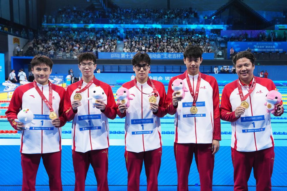 新华社深圳11月15日电(记者孙飞 高萌)全运会游泳比赛中,4×200米自由泳接力或许不是最重要的比赛。但对于山东队的四位“05后”大男孩来说,这是非常重要的,尤其是在他们夺得总冠军之后。 11月15日,山东队刘培新、赵一璞、李易峰、张占硕与教练金浩(从左至右)在颁奖仪式后合影。新华社记者 杜宇 摄 15日,男子4×200米自由泳接力决赛,山东队与浙江队展开角逐。山东队由刘培新、赵一璞、李易峰、张占硕组成,四人都是2005年以后出生的;浙江队由费立伟、孙杨、潘占乐、王顺组成,其中包括三名奥运会冠军和亚运会冠军。但山东大佬们以7分05秒36笑到了最后条件。张占硕也在本次全运会上夺得了个人第四枚金牌。首回合,浙江队的费立伟取得领先,山东队的刘培新后来居上,接应。次回合,山东队的赵伊普扩大了优势。第三回合,浙江队潘占乐强势进攻,取得微弱领先。第四回合,山东队张占硕再次逆转局势,率先罚球。 “赛前,我们四个人就想着游自己的球杆,我们四个人齐心协力,尽力而为,结果不会差。”刘培新说,“面对浙江队,他们是我们青少年时期的长辈,对长辈最大的尊重就是走出赛场。” 11月15日,山东队第四号球员张占硕在比赛中。新华社记者 杜宇 摄 浙江队落后山东队1秒38秒,中国公安体育协会代表队获得第三名。不过,浙江队的徐嘉余在男子200米仰泳比赛中保持了统治力,以1分56秒63完成全运会四连冠。这也是徐嘉余在本届全运会上获得的第三枚金牌,他的全运会金牌总数也增至15枚。赛后,徐嘉余表示:“对我来说,没有悬念(夺冠)。”11月15日,浙江队球员徐嘉余首发出场。新华社记者 夏芳芳 摄 在其他项目中,上海队世界纪录保持者秦海洋在男子200米蛙泳中以2:07.69的成绩实现全运会三连冠;在最后的100米自由泳决赛中,亚洲纪录保持者史贝为香港队夺得第二枚游泳金牌;全国200米蛙泳决赛,江苏队15岁“小妹妹”陆钦瑶获得冠军金牌2:23.63。