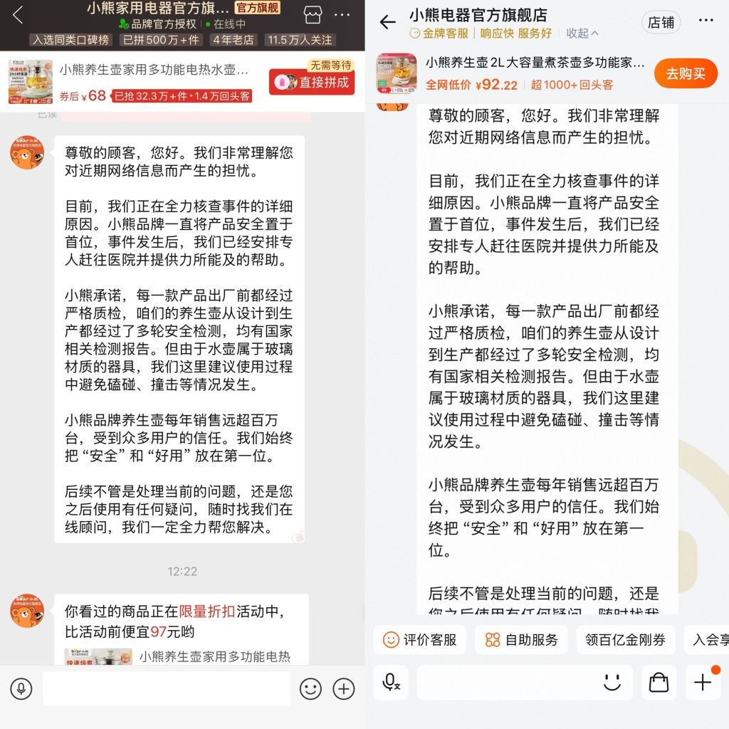 熊品牌保健厂的年销售额超过100万辆,最近暴露于突然的爆炸,导致男孩燃烧它。在事件发生期间,该公司参与的Xiaoxiong电器于9月28日公开回应:这已充分证明了该事件的详细原因。事件发生后,一个特殊的人被修复以赶往医院,并尽其所能提供帮助。 9月25日,吉南(Jinan)的一个网民在社交媒体上发布了许多图片,并写道,9月20日,在家中使用的熊电玻璃保健池突然爆炸,导致一个一岁孩子的40%的身体燃烧。该论文根据上述消费者发布并进行了咨询,搜索了电子商务平台。在Pinkuoduo“ Xiaoxiong家用电器官方旗舰店”中,上述“相同风格”的保健锅目前的价格为68元,表明“ 323,000多件被售出”; “小火”G TAOBAO的电器“客户服务”回答:“ No Model”,并解释说“对于不同商店出售的不同样式,这是正常的。 ““健康锅爆炸”作为消费者,上述商店的客户服务一直在发布相同的响应:我们已经确认了事件的详细原因。在离开工厂gawatega保健锅之前,在严格的检查质量中,经历了许多从设计到制造的生存检查,并且所有人都对既避免使用玻璃及其均可进行效果。 Health Pots每年销售超过一百万个单位,并根据消费者发出的信息,将许多用户放在首位。OT。 9月27日,网民进一步更新了其开发项目,称Xiaoxiong Electric派遣了广东的某人亲自交谈和处理。该公司的工作人员向他询问了医生有关孩子的诊断和治疗计划,并承诺根据随后的治疗状况采取下一步治疗,以确保孩子接受适当的治疗。该论文称为Xiaoxiong Electric,电缆人员说,专家目前正在遵循,并且验证仍在进行中。公共信息显示,Xiaoxiong电器成立于2006年3月。它是一家小型家用电器公司,其“ Xiaoxiong”是其主要独立品牌。它在2019年的深圳证券交易所上市。其产品占据了厨房,生活,个人护理,母亲和婴儿领域,2016年至2023年的收入增长率超过20%。今年9月14日,在官方网站上发表的一篇文章提及D那只熊健康坑总是被消费者所爱和认可。通常,一个熊健康锅每11秒就在一个家庭中。自2022年以来,整个网络的综合销售额已超过1000万台。根据许多迭代,1.5升全票健康锅正在不断变化。锅会消耗健康,快速烹饪和实用性,并为许多家庭和办公室工作人员提供安全的选择,以维持今年秋天的健康。记者JI SIMIN负责编辑:Chen Xia在发表演讲时,请遵守对服务协议的新闻答复