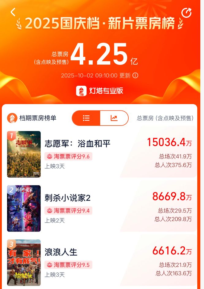 经济业务记者| Bi Yuanyuan 10新电影在国庆假期里激烈地战斗,谁有能力获胜?根据灯塔专业版的数据,直到10月2日上午9:00,2025年国庆假期的票房达到了4.25亿元人民币,“自愿军:血腥的和平”,“杀死2”和“杀死2”和“ Wanglang Life”小说在Box Office办公室前三名。图像来源:灯塔专业版令人惊讶,将近半个月发布的“ 731”是第一个成为“黑马”的人。 9月30日晚上,负责电影院的人每年有超过1000万元人民币透露向记者透露的“日常经济新闻”(从此处指定的bseveral“明智的记者”)表示,国定假日预售情况直到“ 731”之后才改善到10月1日的63张电影门票后,才得到改善。D仅几个小时。灯塔专业版的数据分析师Chen Jin告诉Meike的记者,“ 731”不仅在票房中排名前三名,而且平均数量超过30位,在不满意的季节中带领其他电影。这部电影在市场的沉没中表现出色,第四诱饵城市的票房一部分是可提供高达35%的票房。就门票价格而言,今年国庆节的第一天的平均票价为38.7元,从去年同期的41元人民币降低,看电影的门槛进一步降低了。然而,尽管票价降低了,但今天的国定度假电影的预售速度也放慢了。经济新闻记者回顾了电影界的观察员和电影的“ Liancheng Yiqian”电影,大多数观众都处于等待状态,并且在预售舞台上不急于购买门票。 “他们ain是看电影不再是公众的主要娱乐选择。许多人选择等待电影“成为圈子”或在决定进入剧院之前获得广泛的认可。“超过1亿元的销售速度放慢了速度,剧院调整了电影制作时间表,以节省现场并监视售前的情况,并在当今的国定假日开放前,根据Lighthouse Professional Edition Data Data Data Preecter,直到9月15日,直到9月15日至10月5日,票房为10月,到了10月5日,到达了10月5日,到达了10月5日,曾在10月5日至10日。 8)超过1亿元人民币,“震耳欲聋”,“小说家2”和“志愿者:血腥的和平”是预定的售前售票处的前三名。2025年国庆假期的CE速度放慢了。 2023年的国庆假期的票房总销售总额超过了9月27日和2024年9月28日的1亿元人民币。直到国庆假期的前一天才实现这一目标。预售的流行度低于过去两年。迟来的销售市场也使剧院经理陷入电影计划中的问题。 9月30日晚上,负责上述电影的负责人承认,他对几天的电影销售情况和时间表感到不安。 “ Wanglang Life的预售”发射了很多天,但没有出售任何票。后来,游戏数的数量更改为“ 731”,并且票务很快被卖出了。”负责人说,在尝试添加“ 731”后,该电影在短短几个小时内就出售了大约半个月。这种变化叹了口气,“电影市场在国庆节的第一天发生了变化”。是什么除了即将发行的电影重新发行以吸引观众时,更令人惊讶的是,即使很快发行的电影也很快就会发行。 Water”将于10月3日在大陆重新发行,并在9月30日晚上重新发行,一些观众跳过了新的国庆日电影,直接购买了电影票“ Avatar:Avatar:水的方式”。陈Jin表示,就Urban分布而言,与上一年相比,与上一年相比,四分之一的票房比例都显着增加。 Kingdoms" at "ang sertipikasyon ng Bi Zhengming", mas gusto ng mga madla sa Northeast China ang komedya ng komedya na "Wander Life", habang ang mga madla sa South China the pre-sale box office of the National Day holiday in 2025 has slowed significantly Compared to previous years, from the perspective of the film supply side, the lineup of this year's national day holiday is actually quiTe Rich。根据《灯塔专业版》,今年的国庆电影仍然保持多样化的趋势,幻想,动作,战争,戏剧,动画,历史,喜剧,犯罪,犯罪和其他类型的电影在同一舞台上竞争,满足不同年龄的观众的需求以及偏好的需求。电影和电影的年龄在25岁以下的年轻观众中有很大的比例。但是,就预售的势头而言,今年的国庆票前票房更多地取决于球迷群体的支持。 Anu在“ Bi Zhengming的证书”上,以及“小说2”中的丁尚蛋白。过去,增长率通常很慢。 “从“利安钦·伊奇人”看,电影的消费逐渐从娱乐的普通消费变成了过去,变成了文化事件的消费。”这种心理消费的这种变化直接导致延迟购买票的习惯:不再考虑人们观看G电影是一天至日娱乐的“曲目选择”,但希望被视为具有“意义价值”的文化活动。只有当电影真正以声誉或主题的祝福时,他们的决定才能得到对待。 “电影和电视股票的表现不同,随着国定假日的临近,中国电影已成为当今的国定假日的“大玩家”。市场资本和电视领域的关注逐渐增加,相关股票的表现显示出不同的趋势。亨格迪亚电影和电视(603103.sh)在日常限制时(603103.sh)降低了2%的限制;文化(000802.SZ)也略有上升,相比之下,许多电影和电视公司的股票价格(例如Jinyi Film and Television(002905.SZ)),Huayi Brothers(300027.sz)在不同的程度上,很明显。从工业连锁店的相关性的角度来看,许多上市公司都参与了这部民族电影的制造和制作,中国电影,亨格迪安和电视电影的参与最为积极。具体来说,“志愿军队:血腥和平”的制片人包括中国电影和波娜电影; 《小说家2的暗杀》是由Huace电影和电视,中国电影等制作的;在阵容中,列出了中国电影,万达电影和亨迪安电影和电视的阵容。 “三个王国的第一个星空”有一个轻型的媒体人物。制片人名单上也可以看到“双宗明格的证明”和“致命”的制造商,亨格迪安和电视电影也参加了“致命”。作为国庆假期的“主要力量”,中国电影在此期间参加了10部新电影中的5部电影,内容布局也支持其股价。上